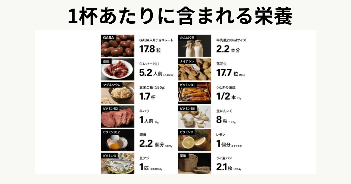 | 成分 | エネルギー: 106kcal、 タンパク質: 16.8g 脂質: 2.4g 炭水化物: 4.4g 食塩相当量: 0.3g 亜鉛: 15mg マグネシウム: 130mg~205mg ナイアシン: 3.0mg ビタミンB1: 0.54mg ビタミンB2: 0.54mg ビタミンB6: 0.60mg ビタミンB12: 1.3μg ビタミンC: 100mg ビタミンD: 8.5μg~14.3μg 葉酸: 38μg~81μg 機能性関与成分: GABA 100mg | エネルギー: 101kcal タンパク質: 16.3g 脂質: 2.1g 炭水化物: 4.9g 食塩相当量: 0.3g 亜鉛: 130mg マグネシウム: 130mg ナイアシン: 3.0mg ビタミンB1: 0.54mg、 ビタミンB2: 0.54mg、 ビタミンB6: 0.60mg ビタミンB12: 1.3μg ビタミンC: 100mg ビタミンD: 8.5μg~14.9μg 葉酸: 38μg~86μg 機能性関与成分: GABA 100mg |